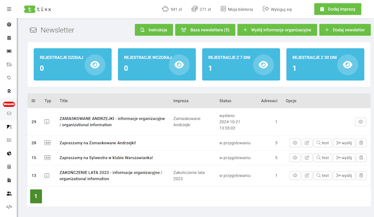Poza wysyłką newslettera reklamowego, z systemu możesz także wysłać maila z informacjami organizacyjnymi do wszystkich klientów, którzy zakupili bilety na daną imprezę.